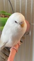 She is a white parakeet. She is hand trained and responds to her name. She likes millet.