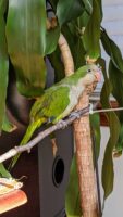 Green color Quaker has leg band on him but unknown information on the band. Can speak few words like peekaboo, hello