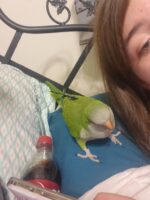 He answers to Leo and peek-a-boo. He is green with the blue undertone