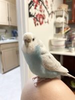 My parakeet Juju is light blue and white. She has a hump on the left side of her neck. She has a dark brown nose and is fully flighted. She likes oranges, bananas, millet spray and seeds. She is friendly but cautious of strangers. She likes men more than women typically and may come to up if you coax her with food and calling her name Juju.