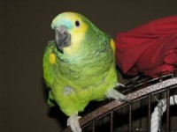 My blue fronted amazon parrot flew away today when I was transferring him from his outdoor to indoor cage. He has full flight. He went missing near the Cathedral and Pioneer Village area. If you see him please contact me as soon as possible.