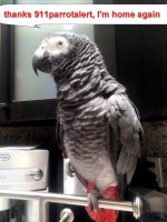 My African Grey escaped from his cage while on my back porch. The perch fell off the cage and I carefully opened the door to replace the perch, but the bird managed to squeeze between my hand and the door and flew away. He flew away on a Saturday the 24th and was on his own until the following Wednesday 27th. He survived on his own four days and endured several summer thunderstorms during that period. By Wednesday he had managed to fly two miles from my house. . where they took him in, bought him bird food and were keeping him in an empty bedroom with no cage since they did not have one. They kept the bedroom door closed because they have a lose cat in the house. After a week they decided the bird was too much work and needed to be with his owner. They started searching the internet and located my posting on 911 Parrot Alert. One can only imagine the risk of the environment that house posed for a bird, but the family that found him could not have been nicer and more loving. I was lucky.As soon as I brought him home I took him to the vet for a check-up and a wing clip. He had a minor injury on his chest, but nothing to be too concerned about. He got an injection of vitamins and oral antibiotics for five days. He’s now back to normal.Feel free to share my story and edit it as needed.Many many thanks.Frank Q.