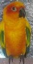 Helio is a 6-8 inch Sun Conure. His primary colors are yellow/orange on head and body and green/blue on wings and tail. He is very friendly, curious, and likely to be interested in people. He loves cashew nuts, almonds, and peanut butter.