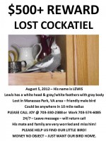 White faced/pied Cockatiel named Lewis. Male – 8 yrs. old – White head with gray body and some white wing feathers. Escaped Sunday (8/o/15) afternoon and up and away (fast and high) in the Manassas, VA area. Very good flier. Lewis is friendly but has a best mate at home that he adores – very bonded and his mate has gone into a severe depression. Attached flier has picture and large reward offered. He has a leg band.
