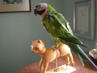 India is a five year old female mustached ringneck with green back, salmon chest, blue tail feathers and a blue-lavender head, with black beak, black neck band and black line between eyes. Besides a loud, repetitive squawk, she also wolf-whistles. At the time of her escape she had little experience flying.