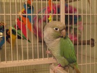 Dixie is a cinnamon turquoise green cheek conure. she is a greenish blue with a tan/cream cinnamon color. she makes kissing sounds and loves food. She is fully flighted.