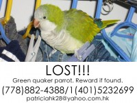 He is a 10 year old green and grey Quaker parrot with a silver ring with “#01(birdhead)168″ on its left feet. He is about 12” long and is extremely approachable to humans..