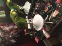 She is 2 1/2 years old, she can say her name ‘Lilwanu”, hello, Mom, what, baby, rings the phone and says hello then mumbles something 🙂 friendly but does nip, Left foot is banded