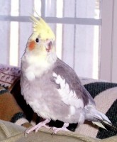 Jojo is a very social and friendly 4 yo cockatiel, will land on your head or shoulders to be close to you. He eats meals with the family, is playful(peek-a-boo) and bright and learns to whistle songs from the school band practice, enjoys kissing and head feather picking. He spends every morning on Mom’s shoulder. In Aug 2011 he voyaged with his family from NY to CA by car with Mom and Hannah (15), and other pets CJ (husky) and Herman (chinchilla) where he now lives. He receives hours of daily handling and other family interaction. He eats organic corn and peas (his favorite). He goes to bed early and wakes when the coffee is brewing. He “talks” whenever someone is on the phone. He is so loved and missed his family expects to care for him for many years to come. We trust your help will bring him home.