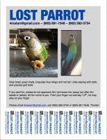 2-year old – Grey head, green body, turquoise blue wings and red tail. Loves to play with bells and practice golf balls. Very affectionate with us. Always asks us to bring our finger for him to climb on by lifting his claw up and waiting. Has a bond with our chocolate lab. Loves to nibble on wet hair. Loves bath. He was scared by a noise and flew out our garage door in the Hawthorne Village area in Milton, ON. When approached, let him come to you with treats on your hand – say the word up and he will get up on your finger.