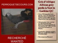 We received a call at Perroquetsecours for a lost 4 years old african grey in Lachine in the area of 10th Avenue and Sherbrooke on November 22nd 2011 in the evening. There’s a reward for the safe return of this bird. Please contact Mélanie at 450-933-5562 or Perroquetsecours at 450-567-8765