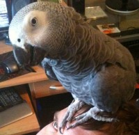 Typical African grey colouring. All grey with a red tail. Missing some feathers around the back of his neck which have never grown. Can say his name and some other basic vocab.