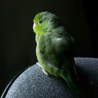 bright green, has hook bill, almost one year old. wings were clipped as a baby, but most have grown out since then. clumsy. responds to name and kissing noises. has a quiet chirp when curious or scared and loud when she wants attention.