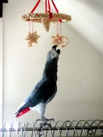 Description: Grey, with red tail, black parrots beak, silver band with letters and numbers, including FL00, as well as other numbers and letters. Owen speaks English words and phrases, laughs in a woman’s voice and whistles show tunes (“The King and I,” Singing in the Rain,” “Chocolat,” etc.).