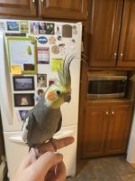 Ollie is a gray cockatiel with white patches on his wings, a bright yellow face with orange cheeks, and a full crest that curls forward when he’s curious or interested in something. He says “peekaboo” “whatcha doing” and whistles “If you’re happy and you know it” “Mr Sun” (preschool song) and makes R2-D2 and fake sneezing sounds. He’s very active and vocal, he will step up on your finger and may bow his head for a scratch.