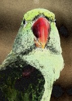She is green with a slight red ring around her neck. She has an orange and red beak.