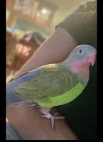 Mithi is a princess parrot , pink neck, pink beak, green feathers, and long blue tail. long nails. and a band on her right foot. she is very sweet and gentle.