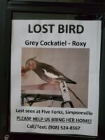 Roxy is a very friendly cockatiel who accidentally escaped. She is missing part of one tie and has another tie that is crooked. Last seen in Five Forks area of Simpsonville. Please call or text 908.524.8567 if found or spotted.