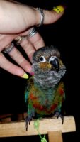 SEEFA is a 4-5 month old Handraised CB conure who was let out between 11am and 3pm of my house after someone tampered with my window… He legt with a baby black capped conure who im also looking for as its only 3-4 months and still being hand fed