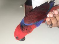 Young bird. Tail feathers very messily apart. Can say a few words. Bonded to me. Does not know how to land/descend properly. Has a band on right leg starting with A.