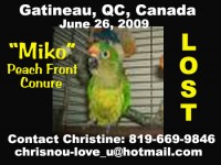 Perdu: Canada, QC, Gatineau, Conure à front pêche : Miko, 26 juin 2009