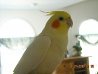 Birdman is a female cockatiel. She is all-yellow … her face is a bright yellow color with bright orange cheeks. However, her body is a more pale yellow, it looks almost white.
