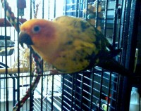 Orange Head, Yellow breast, Wings with yellow shoulders with green tips, long green tail with some blue. Male, 2 years old and 12 inches from top of head to tail. Loves grapes and buttered bread. Says gimme a kiss, gimme, ok, here, taz, yes, no, mommey bird, good boy and occassionally Bappy. Will answer to bappy bird with typical sun conure screech. Huge rward offered for his safe return.