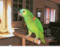 Color: Mostly Green Feathers, Light Periwinkle/aqua Blue on head with some yellow feathers, & yellow under eyes.