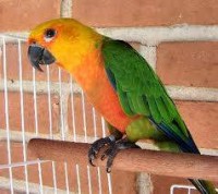 He eats seeds and fruits, and is afraid of cats and dogs. His head and chest are orange and reddish and his wings are green. He has a band on his leg.