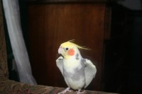 Mostly yellow with grey wings edged in white ,bright orange cheeks. Says your a good boy, good morning ,goodnight, i love you and Kisskiss or kisspoof. Please contact if seen. we are heartbroken and there is a reward if found.