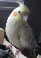 Lacey is a cinnamon pearl cockatiel (yellow with grey colors). Her face is mostly yellow with orange cheeks. She is 1.5 years old, and very friendly.