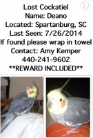Deano is a 14 year old male cockatiel His wings are not clipped He has one white nail One broken toe Screams when flys (typically) Grey with orange /yellow cheeks Alittle bit if white on edges of his wings Contact with any info 440-241-9602