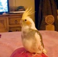 Feb 5-15 Her coloring is more white with gray wings, one gray tail feather, light gray across the top of her chest, her face and crown are a pale yellow. She has a gray line in her feathers across the back of her neck that almost resemble a ring neck. Lilly has one of her back toes on her left foot that doesn’t grow a nail. It just has a stub of one nail. She likes to whistles “Row Row Row Your Boat”, occasionally does the opening tune to “Another One Bites the Dust”. She will also whistle what sounds like “yoo hoo” or “uh oh” when she wants your attention.