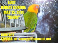 SUNNY IS A JENDAY CONURE WITH A BEAUTIFUL YELLOW HEAD. VERY FRIENDLY. HE IS BANDED AND STILL OUT THERE SOMEWHERE. HE LOVES TO SNUGGLE IN THE BLANKET AND TAKE SHOWERS AND BE BLOW DRIED. REALLY HAS A PERSONALITY. THERE IS STILL A REWARD FOR THE RETURN OF SUNNY. PLEASE BRING HIM BACK HOME.