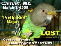 PRETTY BIRD IS A BEAUTIFUL MED/LARGE PARROT WITH A GREENISH/BLUE FRONT/GREY WINGS AND HEAD WITH YELLOW ABOVE THE BLACK BECK AND ALITTLE SPLASH OF YELLOW ON WINGS. PRETTY BIRD HAD A SLIGHT DENT ON HIS BLACK BEAK. HE COULD ONLY SAY PRETTY BIRD AND HELLO WHEN HE HEARD THE PHONE RING. HE WAS BANDED AT THE TIME HE WAS LOST BUT IT COULD BE GONE BY NOW. HE LOVED TO LIFT HIS FOOT TO BE PICKED UP.