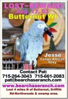Missing in the Northwoods. Seen two years later flying over head and heard in the driveway. Has a good vocabulary. A wild caught grey. Lived with me for 14.5 years. I can identify him by what he says. Calls himself “Lipsbird”.