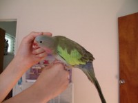 He was very tame. He did not like to be pet on his back, but he loved getting kisses and being out of his cage. He did not learn to talk, but he makes a loud “scree” that sounds like a cockatiel and bobs his head making “ticking” sounds.