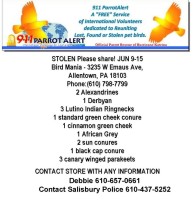 These birds were stolen from Bird Mania, Allentown, PA 610-798-7799. Most of them were still being hand fed. Please help. They will be looking for handfeeding formula and also to sell them. Please contact the Salisbury Police 610-437-5252 or Debbie 610-657-0661. My heart breaks that something will happen to my babies.