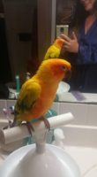 He’s very friendly and will come to you, He loves to dance,enjoys cheese it crackers,grapes,and apples (cut up very small)and sunflower seeds , and kind of fruit juice or nectar …he got startled by a flock of birds which were outside my sliding doors and flew outside in their direction, we were unable to keep up with them as they were very high and going over neighborhoods, I lost sight of him over the Holiday Lake Villas.