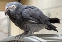 Cuddles has a slightly bent beak and is the smaller Timneh breed grey.