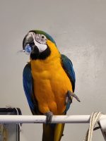 Leyla is a young blue and gold Macaw will play peek a boo and yell at Pepper the dog, she will ask What doing. she is easily spooked, if found contact me right away.