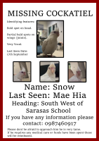 He has a bald spot on his head and on the joints of his wings, he’s extremely vocal and will come to you on calling his name or whistling.