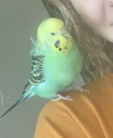 She is a 3 year old female parakeet. She has a completely yellow head and a turquoise body, with a navy blue tail. She has a silver band on her left foot, but I do not know the band number. My number is 731-819-5587