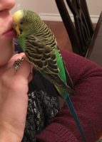 Green, yellow, black, blue, white. Very tame and friendly. Flighted. Responds to kissing/affectionate noises, very good at mimicking.