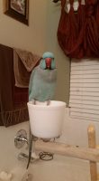 Freddy had not been flying long since his last clipping. Only a few days. He is about three years old, turquoise blue with a black band around his neck and a red-rose beak. He is molting. He has a blue band on one of his legs.