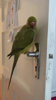 He is just under 2 years. He can say peekaboo and meow when prompted and excited. He whistles in a very specific way “weeewop” and does the typical Indian ringneck bird screaming. He is olive green with a darker back tail (grey).
