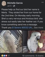 she is an umbrella cockatoo & was stolen at around 4am on 4th of July, her cage was cut & thief took her. A police report has been filed.
