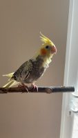 2 months old baby cockatiel named jazy he is very friendly and tamed if you approach him with hand he will step on it he responds to his name and whistles he has a bright yellow head and crest his tail is also yellow but underneath has markings that looks like black smudges . We