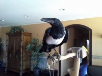 Slightly crooked right foot , spotted many times in different areas in North Carolina and South Carolina usually at back yard feeders , he is a crow breed bird and raised from a hatchling and very deeply loved and missed ., last seen with jesses and leads still attached at ankles .