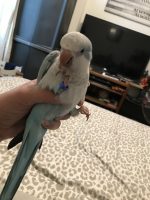 She is a loving bird she loves people she is gray & turquoise and when she spreads her wings she has sky blue in them she has a blue band on her left leg